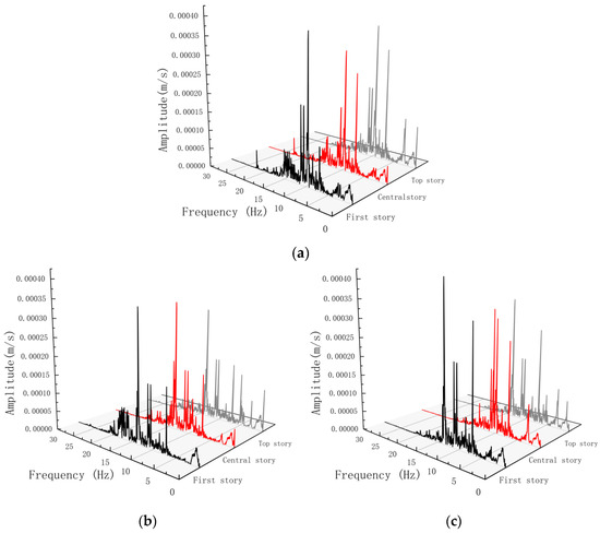 Mixed-direction velocity frequency spectrum diagrams at the measuring points on each floor of models with different numbers of stories: (a) the 5-story model; (b) the 8-story model; (c) the 11-story model.