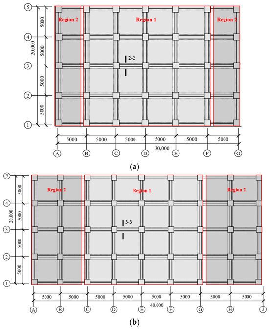 Following the establishment of joint modeling approaches for prefabricated frames, a standardized reference structure conforming to design codes was required to serve as the baseline model for subway-induced vibration analysis. Fundamental site characteristics included Site Classification II, Seismic Design Category 1, seismic precautionary intensity 7 (0.1 g peak ground acceleration), site-specific characteristic period .35 s, and terrain roughness Class B. Material specifications comprised C30 concrete for structural elements, HRB400-grade steel for longitudinal reinforcement, and HPB300-grade steel for slab distribution bars. Loading criteria were as follows: floor live load 2.0 kN/m2, floor dead load 3.5 kN/m2, roof live load 2.0 kN/m2, occupied roof dead load 5.5 kN/m2, beam linear load 8.5 kN/m, parapet linear load 3.0 kN/m, basic wind pressure 0.4 kN/m2. The structural layout featured a 4 × 4 bay configuration (Figure 3) with 5000 mm column spacing, 3600 mm story height, and 5 stories. The structural design parameters were input into the PKPM2025R2.3 software to develop the baseline frame structure following Design Code [9].
