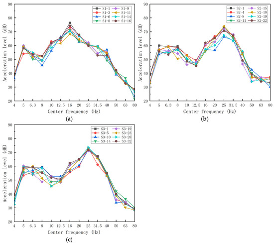 One-third octave vibration levels of each room with different total numbers of spans: (a) S1; (b) S2; (c) S3.