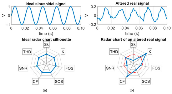 Radar chart from: (a) an ideal sinusoidal signal, (b) an altered signal. The ideal shape is highlighted in red for clarity.