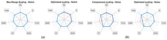 To support the adequacy of these visualization decisions, a sensitivity analysis was conducted using synthetic signals. For selected events, multiple radar charts were simulated with different scaling functions, and the configuration that offered the best performance across the studied events was ultimately selected. Figure 2 illustrates two representative comparisons: in Figure 2a, a radar chart with axis ranges based on the maximum values observed in the dataset is compared to the optimized model under a notch event; in Figure 2b, a chart with more compressed axes is compared to the optimized model under Gaussian noise (40 dB). The results showed that excessively wide axis ranges can visually suppress distortions caused by events such as notch, rendering them indistinguishable. Conversely, overly narrow ranges tend to amplify irrelevant fluctuations due to noise, especially in real measurements, potentially leading to false detections. Moreover, they may obscure the evolution of indicators during an event.