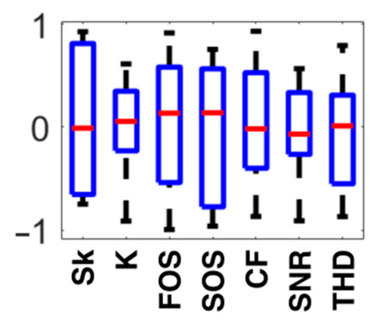 Additionally, boxplots are used to visualize the information extracted from each signal. The statistical method, shown in Figure 3, allows visually summarizing the distribution and variability of a data set, making it easy to identify extreme values and providing a quick overview of how the data are distributed. Therefore, this approach enables the examination and comparison of the distribution of values assumed by each indicator used in the proposed radar chart tool. Given the varying scales of these indicators, a normalization process becomes imperative. As a result, indicators are normalized to ensure their values fall within the range of −1 to 1, with the optimal indicator value remaining at zero, while the most unfavorable case is represented at either +1 or −1.