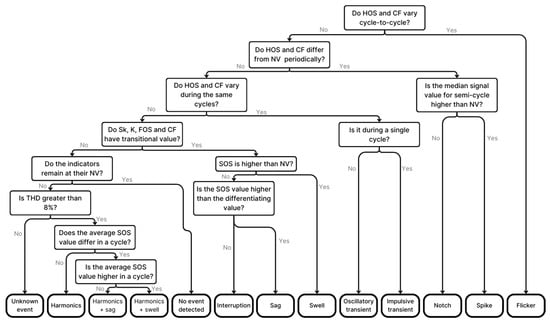 Although clear patterns have been established in synthetic signals corresponding to at least 90% of the events, the presence of noise and distortion of real signals causes the correspondence between the expected behavior patterns and reality to be at least 83.33% for real impulsive transient events, and 96.15% for real sags, confirming a margin of error for the tool. However, the event detection through the proposed system surpasses traditional tools, such as boxplots, in all cases. Furthermore, unlike purely visual methods, the decision tree provides a quantitative system for classifying events.