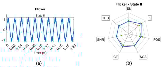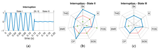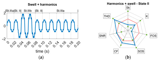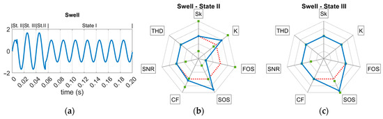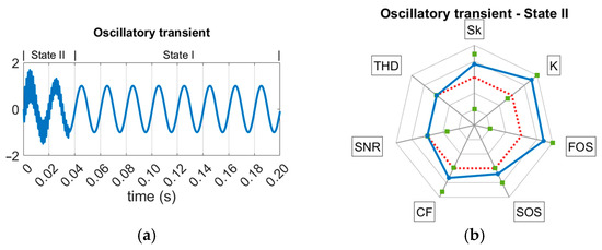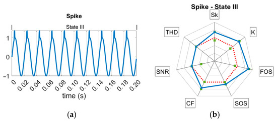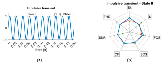Subsequently, Figure 6, Figure 7, Figure 8, Figure 9, Figure 10, Figure 11, Figure 12, Figure 13, Figure 14 and Figure 15 show the list of events studied in Database #1. The signal states are distinguished, and an example of the pattern corresponding to each state per event is shown. The radar charts corresponding to state I have been omitted, since for these synthetic noise-free signals, the shape corresponds to the same behavior pattern shown in Figure 1a. Square marks have been added to each radar chart illustrating the maximum and minimum values that each indicator reach for the corresponding event and state. These values are also detailed in Table 2, Table 3, Table 4, Table 5, Table 6, Table 7, Table 8, Table 9, Table 10, Table 11 and Table 12.