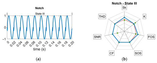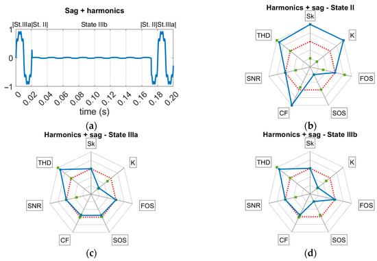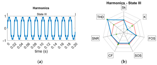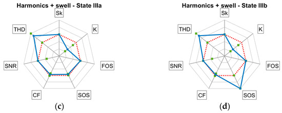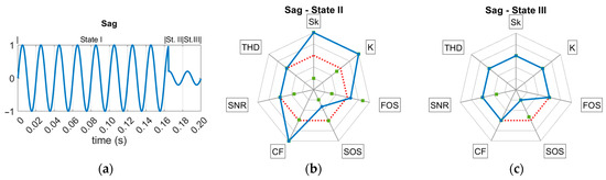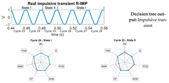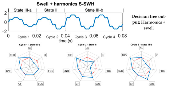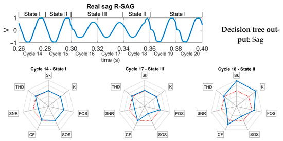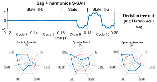 The radar charts of S-SAH (Figure 17) and S-SWH (Figure 18) signals correspond to the patterns established for both events, and the decision tree correctly classifies the types of events. THD reflects the presence of harmonics. Furthermore, Sk and FOS are immune to harmonics in states III-a and III-b, and their value is altered in state II, while the kurtosis value is quite affected by harmonics (states III-a and III-b). K and CF also vary under this unstable state. The values acquired by these indicators (Sk, K, FOS and CF) in state II are the so-called “transitional values”. The SOS value varies proportionally to the amplitude of the waveform: in the states with sag (II and III-b in Figure 16), SOS decreases, and under a swell, the value obtained increases (Figure 17). If the SOS value reaches a value lower than 3.12 × 10−7, then the event is an interruption. This value is named a “differentiating value.”