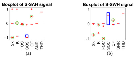 Boxplots in Figure 19 correspond to S-SAH (Figure 19a) and S-SWH (Figure 19b) signals. The outliers from states II shown in Figure 17 and Figure 18 have been circled. Notice that for the complete signal (10 cycles), in both cases, two cycles in state II are located through the outliers. Based on the boxplots, the most appropriate indicators to analyze each type of PQ event are defined. The distance from the median and box to zero in the diagrams in Figure 19 of THD, SOS and K indicates these indicators to be more suitable for detecting harmonics with sag/swell.