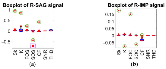 Figure 22 shows the boxplots of the indicators’ values obtained from R-SAG (Figure 22a) and R-IMP (Figure 22b) signals. The outliers of state II of Figure 20 and Figure 21 have been circled. Unlike boxplots drawn from synthetic signals, for real signals, a box is obtained around the nominal values, and even outliers appear close to these values due to noise. The short sag duration in R-SAG signal versus the total signal duration causes the values acquired by SOS during the event to be marked as outliers (boxed in purple in Figure 22a).