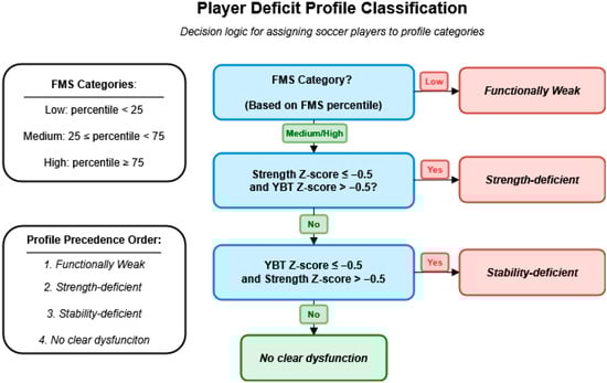 Rule-based logic for functional profile classification. Legend: Functionally Weak: Athletes with low overall movement quality, defined as an FMS score in the bottom quartile (≤25th percentile), regardless of strength or balance performance. This profile reflects generalized functional limitations in mobility and stability tasks. Strength-Deficient: Athletes not classified as Functionally Weak but with substantially low strength (Z ≤ −0.5) and normal balance (YBT Z > −0.5). Indicates a specific deficit in force production capacity. Stability-Deficient: Athletes with normal FMS and strength but poor balance (YBT Z ≤ −0.5) and preserved strength (Strength Z > −0.5). Reflects isolated deficits in dynamic stability. No Clear Dysfunction: Athletes with all three domains (FMS, strength, balance) within normal limits (i.e., no score ≤ −0.5 SD). Represents a well-rounded functional profile with no major deficits.