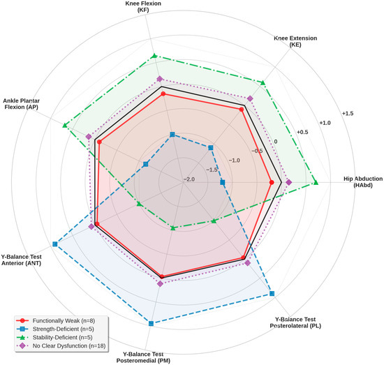 Thirty-seven male youth soccer players (mean age 13.3 ± 1.6 years; full demographics in Table S1) were classified into four functional profiles using the expert rule-based system (Figure 1; Table 1); 8 players (21.6%) were categorized as Functionally Weak, 5 (13.5%) as Strength-Deficient, 6 (16.2%) as Stability-Deficient, and 18 (48.6%) as having No Clear Dysfunction. All Functionally Weak players had FMS scores ≤ 14, whereas the other groups had higher scores (median = 17, range = 15–21). The Strength-Deficient group exhibited the lowest mean normalized strength values (0.45 ± 0.03% BW), and the Stability-Deficient group showed the lowest YBT performance (84.34 ± 0.61). Athletes classified as No Clear Dysfunction had superior results across most metrics, with strength (0.59 ± 0.12), YBT (89.63 ± 5.11), and FMS scores (18.00 ± 1.97) exceeding those of all deficit groups. Flag categorization revealed 1 Red flag case (2.7%, 3 deficits), 8 Yellow (21.6%, 2 deficits), and 28 Green (75.7%, 0–1 deficit). A comparative radar plot of all functional profile groups is presented in Figure 2.