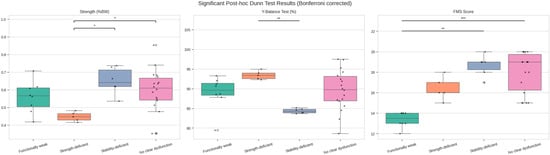Statistical comparisons confirmed that the profiles differed significantly in the domain defining variables. Kruskal–Wallis tests were significant for FMS (H = 21.4, η2 = 0.56, p < 0.0001), strength (H = 10.8, η2 = 0.24, p = 0.012), and YBT (H = 12.9, η2 = 0.30 p = 0.0049) across the four profiles. Bonferroni-adjusted post hoc Dunn tests (Figure 3) revealed that Functionally Weak players had significantly lower FMS scores than some other groups (p < 0.0001 vs. no-dysfunction; p = 0.001 vs. Stability-Deficient) but no vs. the Strength-Deficient group (p = 0.345). Strength-Deficient players had lower strength values than no-dysfunction players (p = 0.044) and Stability-Deficient players (p = 0.011) but did not differ in YBT scores from them (p = 0.481). Conversely, the Stability-Deficient group did not have a significantly lower YBT than the no-dysfunction (p = 0.065) and Functionally Weak (p = 0.267) groups, but this metric was different than that in the Strength-Deficient group (p = 0.002). The Bonferroni-adjusted Dunn test heatmaps with p-values for strength, Y-Balance, and FMS across functional profiles are presented Figure S1.