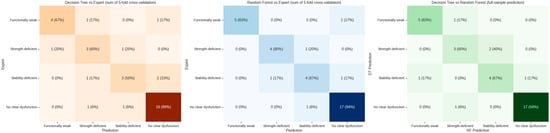 The random forest (RF) model achieved high classification accuracy, especially in identifying Functionally Weak and Strength-Deficient profiles. Importantly, it never confused unrelated profiles (e.g., Stability vs. Strength), suggesting robust pattern recognition. Misclassifications occurred primarily at classification boundaries, e.g., borderline strength values, and never contradicted the expert logic. In contrast, the decision tree (DT) underperformed, frequently labeling mild deficits as No-Dysfunction. These findings underscore the RF model’s superior fit to expert logic and its potential as a reliable decision-support tool.