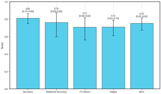 To further assess the reliability and stability of the RF model, 1000 bootstrap iterations were performed on the cross-validated predictions (Figure 5). The mean accuracy was 0.811 (95% CI: 0.750–0.864), balanced accuracy 0.762 (95% CI: 0.600–0.875), and macro F1-score 0.708 (95% CI: 0.562–0.816). Substantial agreement metrics indicated strong model reliability, with Cohen’s Kappa = 0.711 (95% CI: 0.611–0.788) and MCC = 0.753 (95% CI: 0.672–0.815).