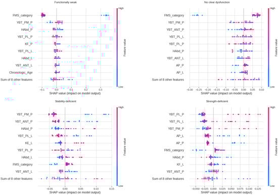Unlike binary screens (e.g., FMS ≤ 14) [14], our system provides specific, actionable targets. If an athlete is classified as Strength-Deficient, the logical response is to prioritize strength development in their program—for example, through age-appropriate resistance training to build muscular power and robustness [35]. In contrast, an athlete identified as Stability-Deficient would benefit more from exercises targeting balance, proprioception, and core stability [36]. By breaking down a general concept of “functional motor skills” into specific components, the profiles ensure that training interventions can be individualized and thus more efficient [2,15]. This approach aligns with recent critiques of injury prediction screens, which argue for focusing on modifiable deficits rather than attempting to predict injury with single cut-off scores [37]. SHAP analysis further confirmed the model’s logic, showing that classifications were driven by domain-relevant variables—FMS for functional weakness, YBT for stability, and isometric strength for strength deficits—while anthropometric factors had minimal influence. This aligns with the recent literature emphasizing the clinical value of interpretable machine learning models, which enhance trust, transparency, and adoption in decision-support systems [38].