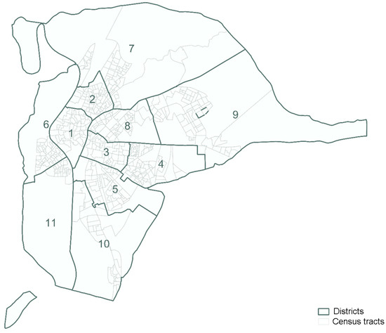 Seville, the capital of the autonomous community of Andalusia, is located in southern Spain (coordinates 37.38863, −5.99534). Seville has a population of 693,229 inhabitants and is the fourth most populous city in Spain [28] and the most populous city in Andalusia. This city is located on an alluvial plain formed by the Guadalquivir River [29], which generates a relatively flat terrain at an average elevation of 5 masl [30]. Seville has an area of 140.52 km2 [31] and is composed of 532 census tracts grouped into 11 districts (Figure 1 and Table 1). The distribution of the average annual income per household among the districts shows a marked socioeconomic heterogeneity in Seville. In this sense, the district of “Los Remedios” shows the highest average incomes, in contrast to the district of “Cerro-Amate,” which shows the lowest average incomes [32].