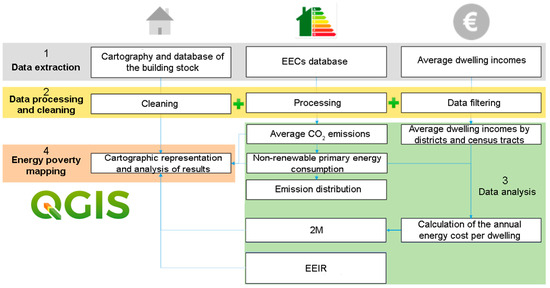The methodology used in this study is based on 5 phases (Figure 2): (1) Data extraction, (2) Data processing, (3) Data analysis and (4) Energy poverty mapping. Data processing and analysis are performed using Python 3.12 and QGIS 3.34.11 ‘Prizren’. Python is used for statistical analysis, while QGIS facilitates the visual representation of data on cartographic maps [33].