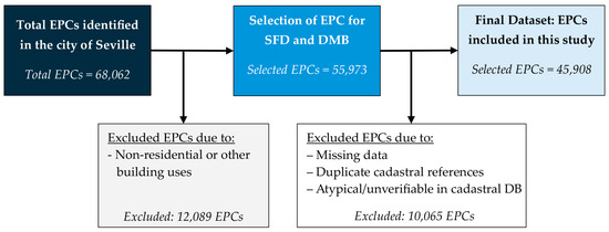 The procedure described below was applied to the database of EPCs (Figure 3). The database initially contained 68,062 energy certificate records. The first step was to unify the format of the records according to the attributes: year of construction, building regulations, typology of the record and postcode. Subsequently, the records in the database were filtered according to their typology, selecting and separating only those corresponding to ‘Dwellings in Multi-family residential Buildings’ (DMB) and ‘Single-family dwellings’ (SFD). Afterwards, the cadastral references, which uniquely identify each property by means of 14–20 digits, were verified to ensure that they were correctly registered. Those data that did not meet this requirement were eliminated.