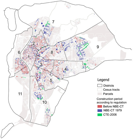 Figure 4 shows the distribution of dwellings according to the regulations in force when they were built. It can be seen that dwellings built to older standards are concentrated in the city center, while those built to more recent standards are on the outskirts.