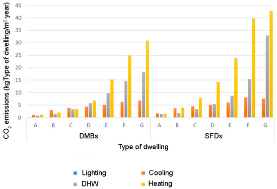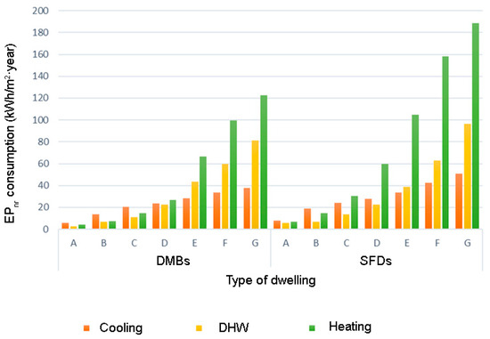 Figure 5 and Figure 6 show, based on the results obtained from the EPC database, the distribution of EPnr and CO2 by dwelling typology and type of energy consumed. It is observed that the EPnr consumption in SFDs is higher than in DMBs. In the less efficient dwellings (classification D, E, F and G), the main energy demand comes from heating, while in the more efficient dwellings it is due to cooling. This pattern is also reflected in CO2 emissions (Figure 5).