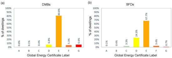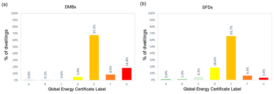 (a) Distribution of DMBs according to the Global Energy Certificate label; (b) Distribution of SFDs according to Global Energy Certificate.