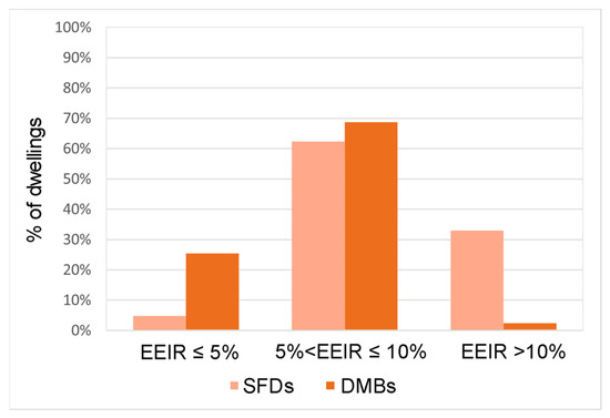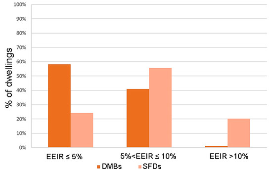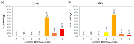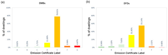 Figure 13 and Figure 14 present the distribution of EPCs for the district by rating label and dwelling typology. The most common label in both typologies is “E” (81% of DMBs and 68% of Unis). However, SFDs show a better energy performance than DMBs, as 92.7% of DMBs present a low energy efficiency rating (“E” or lower), while this percentage decreases to 71.8% in SFDs. A similar behavior is observed in the classification by CO2 emissions (Figure 8), where DMBs maintain a lower efficiency compared to SFDs.