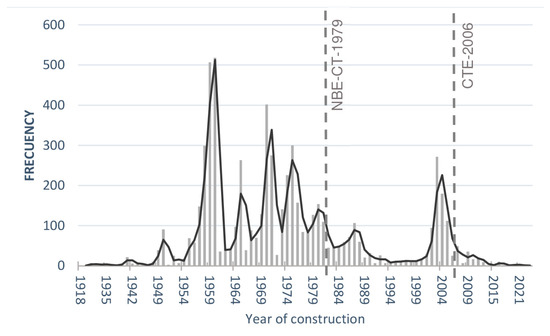 The database analyzed in this study includes 45,908 dwellings. The sample is characterized by the high variability of the parameters evaluated, where there are dwellings with years of construction from 1850 to 2023 and dwellings with floor areas ranging from 12 to 1160 m2. The results obtained show that 60% of the dwellings were built before the NBE CT-1979 standard [43], 33% between the NBE CT-1979 standard and the CTE-2006 [44] standard, and 7% after the entry into force of the CTE-2006 standard.