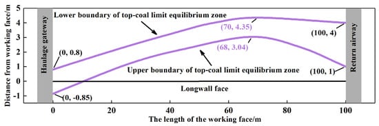 - The boundary spatial morphology of the TLEZ in a fully mechanized top-coal caving face with SDCS takes on an “asymmetric arc-shaped ribbon-like curved surface”. The middle-upper part of the boundary is the farthest from the longwall face, then comes the upper part and the middle–lower part, and the lower part is the closest to the working face. The boundary spatial morphology of the TLEZ along the inclined direction of the working face exhibits a distribution in the form of an “asymmetric circular-arc arch”. The distance between the boundary spatial morphology of the TLEZ and the working face, along the strike direction of the working face, demonstrates a pattern of gradually increasing from top to bottom.