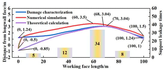 - Through the comparison between numerical simulation and theoretical calculation, it can be seen that the overall pattern of the boundary spatial morphology of the TLEZ in SDCS is consistent. Moreover, this boundary spatial morphology is further validated by the on-site monitoring results. The findings indicate that the analytical characterization of the TLEZ boundary in the fully mechanized top-coal caving face of SDCS is reasonable and feasible.