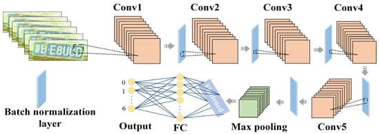 To address the issue that the feature extraction of the convolutional layer is disturbed by the sandstorm environment and the traditional pooling operation fails to meet the requirement of retaining key features, we made improvements based on the AlexNet model, specifically introducing BN layers after each convolutional layer. The BN layer helps to reduce the perturbation of input features, ensuring that before feature extraction by the convolutional layers, the image characteristics are already normalized []. This mitigates the impact of uneven illumination distribution, accelerates model convergence, and improves training stability. Additionally, we utilized max pooling operations to further enhance the model’s resistance to interference, as max pooling retains the most prominent features when noise levels are high [], thereby ensuring the effective extraction of key information from the license plates.