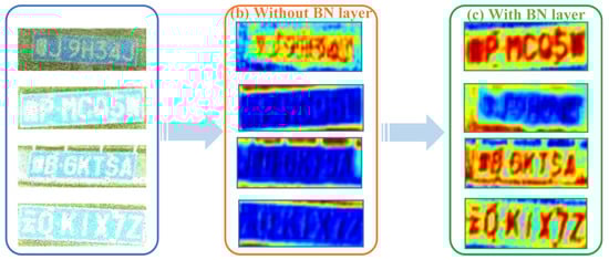 Figure 2 shows the attention levels of different networks to various regions of the input image [,]. Figure 2a represents the input image, while Figure 2b illustrates that the network without the BN layer excessively focuses on the image’s edge information. Figure 2c visually reveals that the network with the BN layer focuses more on the area containing the license plate number. A comparison of Figure 2a–c shows that the addition of the BN layer enables the network to concentrate more on extracting the core information of the license plate while paying less attention to distracting edge information and background noise. In complex environments, it can effectively filter out some unnecessary information in the image, such as lighting variations and cluttered backgrounds, ensuring that the attention remains focused on the license plate number. Thus, adding a BN layer helps to address the limitations of the convolutional layers, significantly improving their feature extraction efficiency, which is crucial for license plate recognition in complex environments. We attempted to integrate the BN layer into the convolutional layer to further enhance the model’s convergence speed and recognition performance, addressing the challenges of license plate recognition in environments with frequent sandstorms and dramatic changes in light intensity.