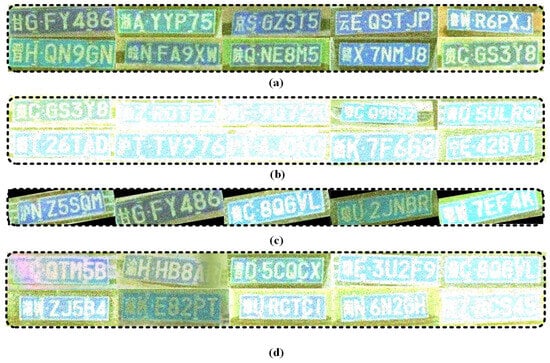 By adding Gaussian noise, salt-and-pepper noise, random noise, and adjusting the image colors, the images are made to appear as if they have more ‘dust,’ with a more yellowish hue, thus more realistically simulating a dust-heavy environment. The result is shown in Figure 3a. Randomly adjusting image brightness simulates conditions of strong lighting, as shown in Figure 3b. Rotation techniques are employed for data augmentation to enhance the robustness of model training and prevent issues such as overfitting. The results are shown in Figure 3c. By covering the license plate surface with a significant amount of ‘dust’ and greatly increasing local brightness, real-world scenarios are simulated where license plates are covered by dust or directly exposed to sunlight, as shown in Figure 3d.
