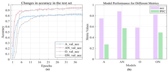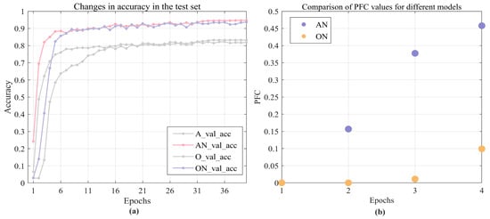 Performance of models with different structures. (a) Changes in accuracy on the test set during training of different models using the same dataset; (b) comparison of accuracy and PFC for different models at almost convergence.