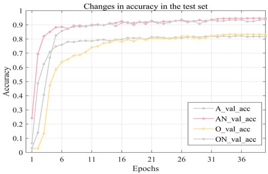 The evaluation metrics for the license plate recognition network model in this study mainly included accuracy (acc), PFC (Probability of Fully Identifying the Correct License Plate Number), and Loss (value of the loss function). Among them, acc is the ratio of the number of symbols correctly recognized by the model in the prediction to the total number of symbols; by comparing the accuracy rates of different models or different datasets, the optimal model could be selected; by observing the trend of the accuracy rate during the training process, we could judge whether the model converged or overfitted; by analyzing the accuracy rate on the test set, we could evaluate the model’s generalization ability. The PFC refers to the model’s ability to completely recognize all the characters correctly on a license plate. It is more stringent than the accuracy rate, as PFC requires that every character on the license plate must be recognized correctly; it is usually lower than the accuracy rate because it is more sensitive to errors. Loss is a metric that measures the difference between the model’s prediction and the true value; observing the trend of the loss value during the training process can determine whether the model learns effectively or not; comparing the loss value on the training and validation sets can help us detect overfitting. Here, A represents the model trained using the augmented dataset, N represents the model with an added BN layer, O represents the model trained using the unaugmented dataset, val indicates the model’s performance on the test set, and train indicates the model’s performance on the training set.