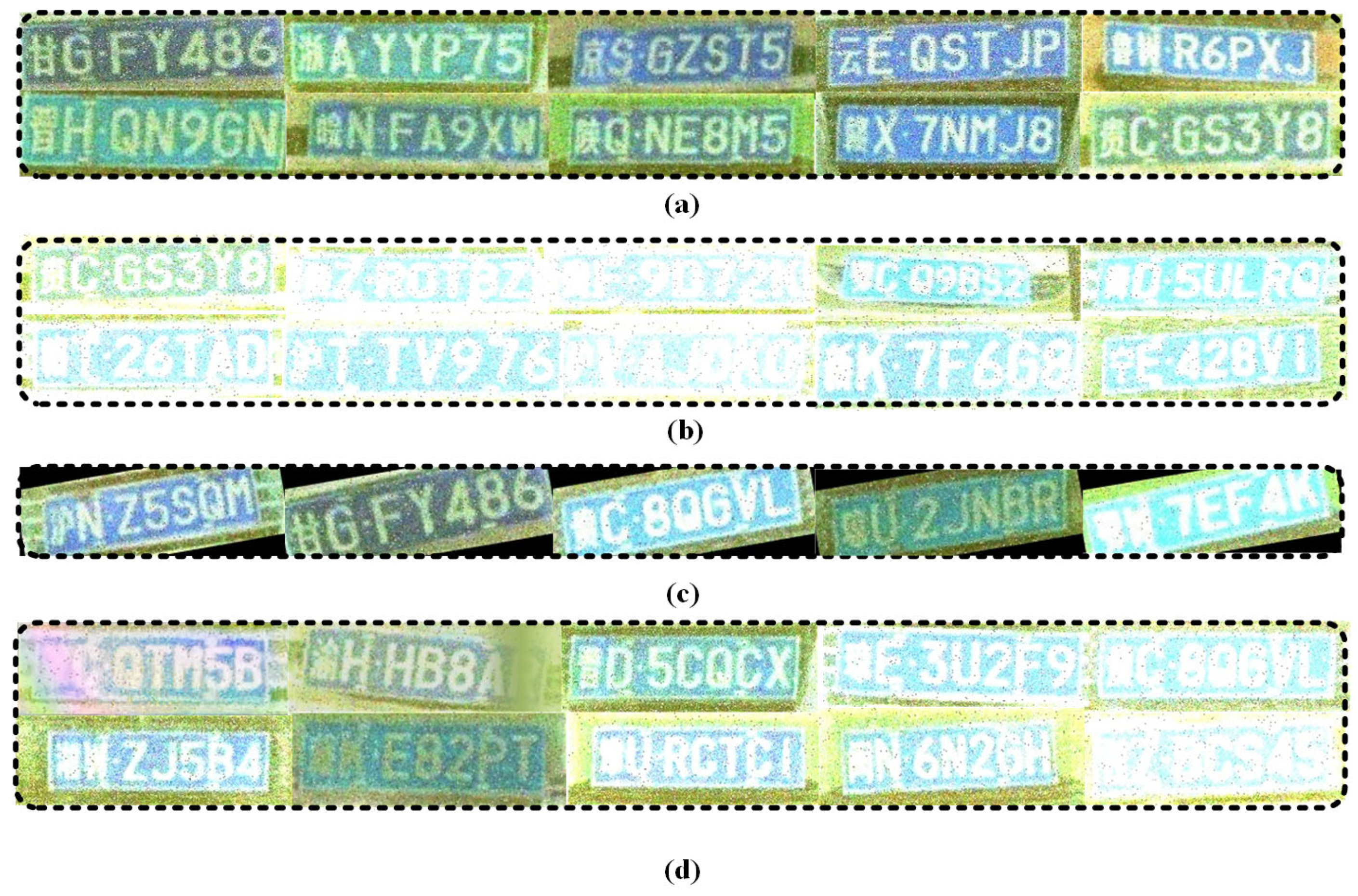 Sample self-built dataset. (a) Simulation of the effect of a license plate after sand and dust coverage; (b) simulating the effect of license plate under the scene of drastic change in light intensity; (c) example of license plate rotation effect; (d) simulation of the effect of a license plate obscured by sand or light.