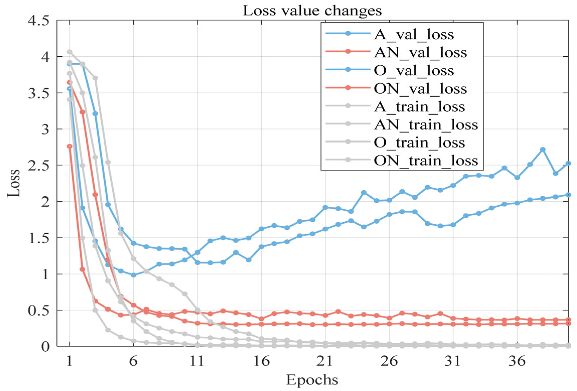 Observing Figure 7, we can see that while the difference between the predicted and true values of the different models in the training set gradually decreased with the increase in training epochs, their performance on the test set varied significantly. Without the BN layer, the error on the test set initially decreased with the increase in training epochs but then began to rise. This indicates that, in the later training sessions, the model’s predictions of the results on the test set became more different from the true results, and the model overlearned the image features in the training set. Although the model’s recognition accuracy remained almost unchanged, the increase in the loss function value revealed the presence of overfitting. In contrast, the model with the BN layer did not exhibit overfitting. This phenomenon indicates that the BN layer, by normalizing the input of each layer, reduces the impact of internal covariate shift and introduces a certain level of noise [40], thereby effectively serving a regularization function [41]. This regularization helps to mitigate the risk of overfitting on the training set and allows the model to maintain better recognition performance when encountering unseen data.