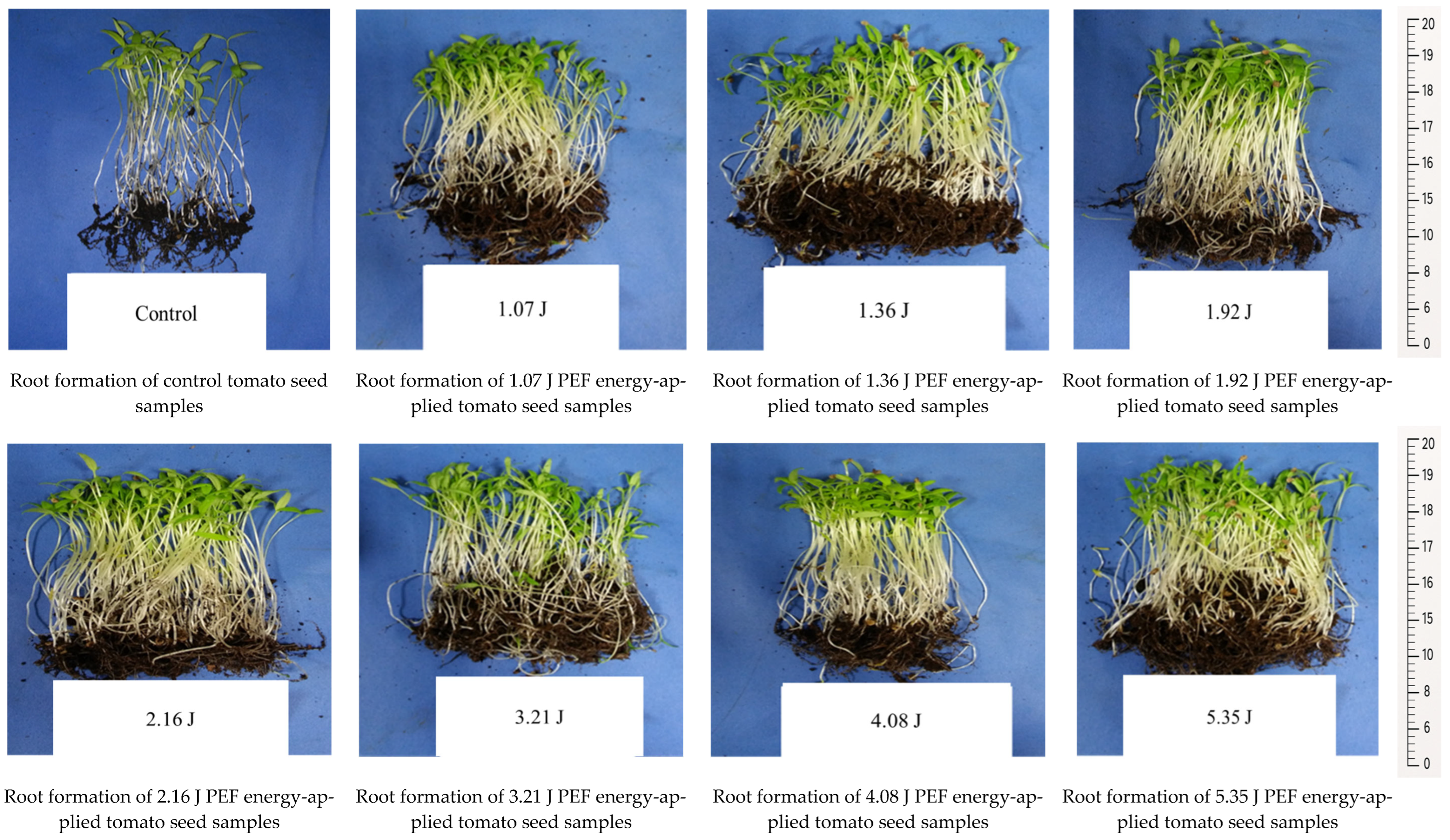 37]. Another study reported that tomato seeds treated with an electric field of 20 kV/cm for 20 s achieved a 100% germination rate, compared to 76% in untreated seeds [