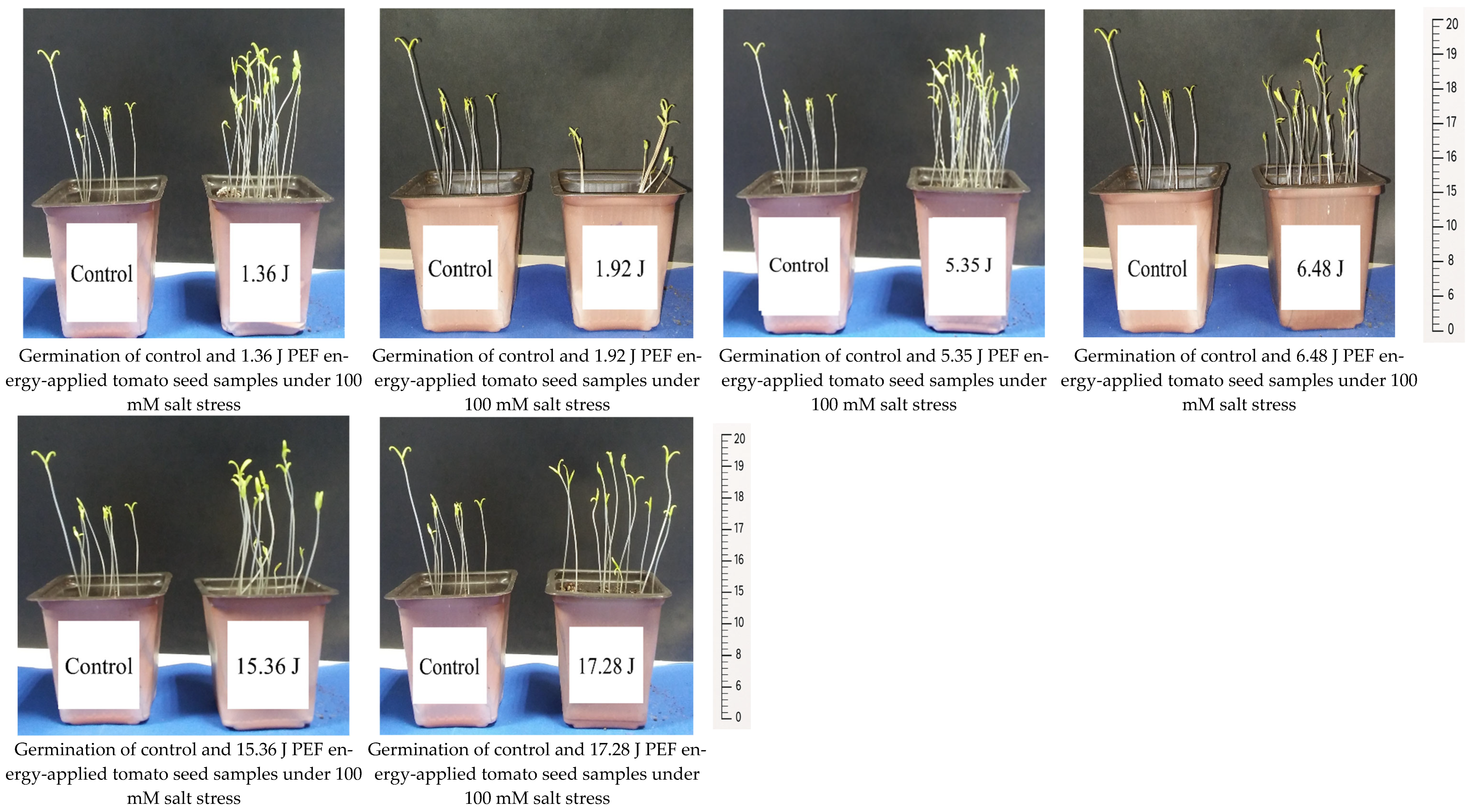 41]. However, salinity tolerance remains a complex and not fully understood process. The PEF treatment may enhance the salt tolerance under 100 mM and 200 mM NaCl stress conditions, possibly by activating one or more of the plant’s stress tolerance mechanisms. An increased salt tolerance following PEF treatments has also been reported in cucumber seeds [