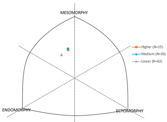 Figure 1 depicts a graphic representation of the somatotype ratings of ILCA 7 class sailors divided into three groups according to their level of general competitive success: higher level (square), medium level (rhomb), and lower level (triangle).