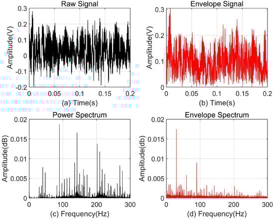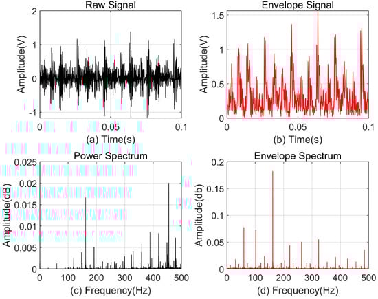 A comprehensive analysis of Figure 2 and Figure 3 reveals that the spectrum of the vibration signal cannot effectively reflect the characteristic frequency of the fault, while the envelope spectrum of the vibration signal can more accurately represent the characteristic frequency of the fault. Envelope demodulation of the vibration signal is an indispensable step. However, relying solely on envelope spectra for fault diagnosis may have limitations and is prone to misjudgment, thereby affecting the reliability of the diagnosis results.
