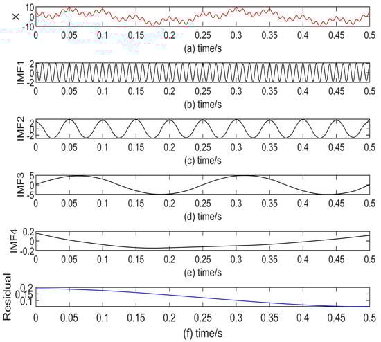 EMD decomposes the signal from high frequency to low frequency into a finite number of Intrinsic Mode Functions (IMFs) and the sum of the remaining terms. For the signal , the implementation process of the EMD method is as follows: