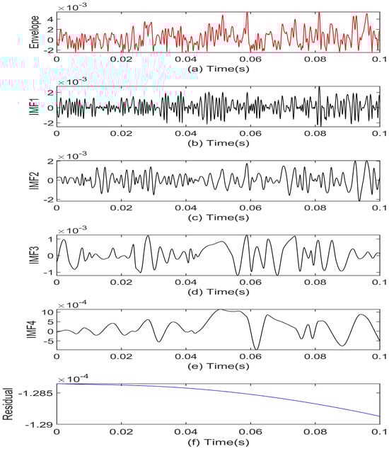 Figure 4 shows the waveform of the three-tone amplitude signal, the IMF after EMD, and the residual amount after EMD decomposition. Specifically, Figure 4a shows the waveform of the original signal; Figure 4b–e correspond, respectively, to the intrinsic modular functions IMF1 to IMF4 obtained after the decomposition of EMD; Figure 4f shows the remaining amount after the decomposition of EMD. The IMF4 component in Figure 4e and the residual quantity in Figure 4f can be regarded as errors caused by the endpoint effect of the EMD algorithm. Figure 4 verifies the effectiveness of the EEMD algorithm, indicating that by applying this algorithm, the separation of the bearing rotation signal and the bearing fault vibration signal can be achieved, and the vibration characteristic signal of the bearing fault can be accurately extracted.