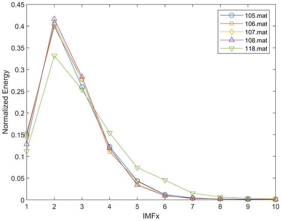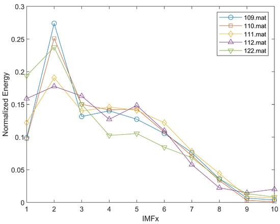 Figure 9 illustrates the ED of the vibration signal measured at a 48 kHz sampling rate at the driving end using an acceleration vibration sensor. The sample datasets, including 109.mat, 110.mat, 111.mat, 112.mat, and 122.mat, are specifically selected for analysis. At a sampling rate of 48 kHz, the arrangement of ED is not monotonically decreasing. When IMFx is within the range of 2.1–2.3, the normalized energy of the bearing drive end dataset reaches its maximum value and subsequently exhibits a non-monotonic trend. Specifically, two peaks emerge when IMFx is within the range of 0–10. This distinctive feature can significantly improve the discriminability of such faults.