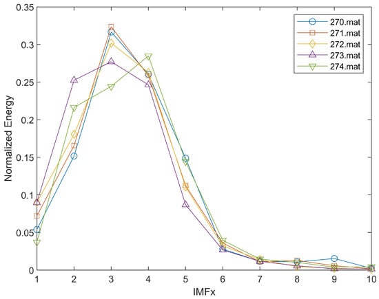 Figure 10 illustrates the measurement of vibration signals at the fan end using an acceleration vibration sensor with a sampling rate of 12 KHz. The selected sample data for ED analysis are stored in files 270.mat, 271.mat, 272.mat, 273.mat, and 274.mat. Similar to Figure 8 and Figure 9, for bearings at the fan end with faults as depicted in Figure 10, the energy intensity of the vibration signal does not gradually decrease from high frequency to low frequency due to the impact of vibration and shock caused by the faulty components. Instead, it exhibits relatively high values in one or more intermediate frequency bands. When IMFx is within the range of 3.0 to 4.5, the normalized energy of the fan end dataset reaches its maximum value and subsequently exhibits a monotonic trend. This is mainly because when the bearing malfunctions, the energy intensity distribution of the vibration signal changes due to the vibration impact on one or more frequency bands in the middle. Consequently, the presence of a fault in the bearing can be determined based on the ED characteristic vector. This diagnostic method is both straightforward and intuitive.