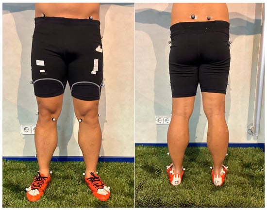 A six-camera Vicon Motion Capture System (Oxford Metrics Ltd., Oxford, UK) was used to capture kicking data at 250 Hz. The protocol required the players to perform the movement on FIFA-approved artificial turf and using a regulation football (complying with FIFA standards: diameter = 22 cm; pressure: 1 atmosphere). Participants wore football shoes appropriate for artificial turf, and prior to data capture, twenty-eight retro-reflective markers (diameter = 14 mm) were placed on specific landmarks on the players’ bodies (Table 2) as per a previously validated model [24,25].