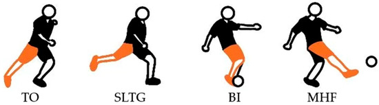 According to previous definitions of kicking, the movement was cropped from the toe-off of the kicking leg to the peak hip flexion of the kicking leg [24,25]. The static and six dynamic trials per trial were reconstructed following Vicon® guidelines [26]. Calibration parameters were adjusted per session, and marker trajectories were labeled and then processed by combining duplicates, resulting in 28 valid trajectories for the static trial and 20 valid trajectories for the dynamic trial (Table 2). The kicking phase was defined using the following key events: toe-off of the kicking leg (TO), defined as the moment the kicking foot leaves the ground; support leg touch-down (SLTG), defined as the first frame in which the support foot contacts the ground; ball impact (BI), defined as the frame when the kicking foot contacts the ball; and maximum hip flexion of the kicking leg (MHF), defined as the peak flexion angle of the hip of the kicking leg (Figure 2). After identifying key events, marker trajectories were inspected frame by frame and missing data were interpolated using Vicon®’s cubic spline algorithm (for a maximum of 10 frames).