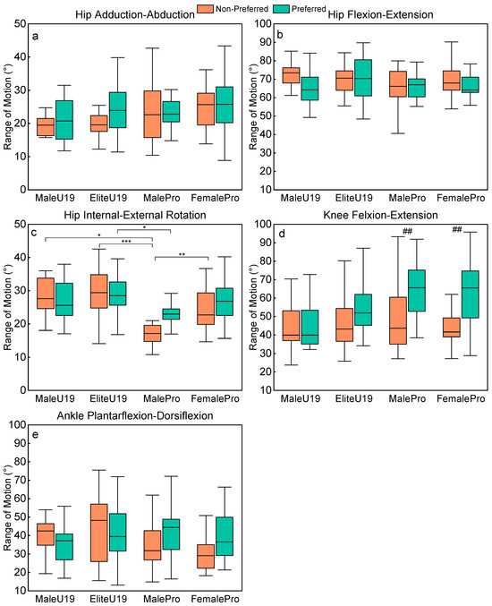 Hip, knee, and ankle ROM. (a) Hip adduction-abduction ROM; (b) hip flexion-extension ROM; (c) hip internal-external rotation ROM; (d) knee flexion-extension ROM; (e) ankle plantarflexion-dorsiflexion ROM. The upper and lower edges of the box represent the 75th and 25th percentiles, respectively. The whiskers extend to the most extreme values within 1.5 times the interquartile range (IQR), while values beyond this range are considered outliers. The solid line within the box indicates the median. The asterisk symbol (*) indicates a significant difference between competitive level groups. *: p < 0.05, **: p < 0.01, ***: p < 0.001. The hash symbol (#) indicates a significant difference in leg preference between preferred and non-preferred leg kicks. ##: p < 0.01.