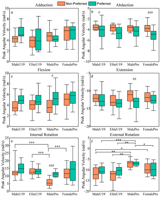 Peak angular velocity of the hip. (a) Peak hip adduction angular velocity; (b) peak hip abduction angular velocity; (c) peak hip flexion angular velocity; (d) peak hip extension angular velocity; (e) peak hip internal rotation angular velocity; (f) peak hip external rotation angular velocity. Positive values indicate adduction, flexion, and internal rotation, while negative values indicate abduction, extension, and external rotation. The asterisk symbol (*) indicates a significant difference between competitive level groups. *: p < 0.05, **: p < 0.01, ***: p < 0.001. The hash symbol (#) indicates a significant difference in leg preference between preferred and non-preferred leg kicks. #: p < 0.05, ##: p < 0.01, ###: p < 0.001.