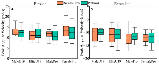Peak angular velocity of the knee. (a) Peak knee flexion angular velocity; (b) peak knee extension angular velocity. Positive values indicate flexion, while negative values indicate extension.