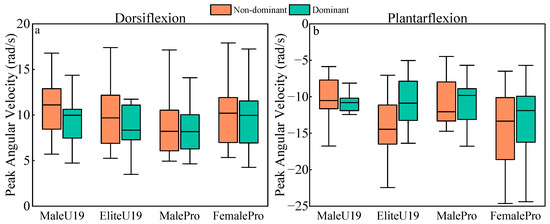 Peak angular velocity of the ankle. (a) Peak ankle dorsiflexion angular velocity; (b) peak ankle plantarflexion angular velocity. Positive values indicate dorsiflexion, while negative values indicate plantarflexion.