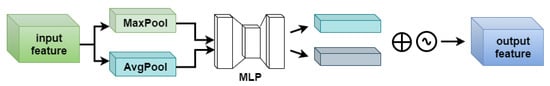 The channel attention module can be used to learn the interdependency and importance of channels to aid the backbone network in extracting the requisite regions for the semantic segmentation tasks in the channel dimension; accordingly, this enhances the model’s capability of capturing some important but easily overlooked features. As shown in Figure 3, the channel attention module first passes the features to both the max pooling and average pooling layers to obtain the global information of the features. This can capture the statistical characteristics of different channels in the feature map and provide insights into the importance and contribution of each channel within the entire feature map. Then, a fully connected network is used to learn the weights of channels to enable the weighted fusion and adjustment of the features from different channels. The two outputs of the fully connected network module are then added in an element-wise manner to facilitate the full utilization of the global contextual information and local detailed information to extract the features of target objects accurately. Finally, the fused result is fed into a sigmoid function. The above operations can be expressed as follows: