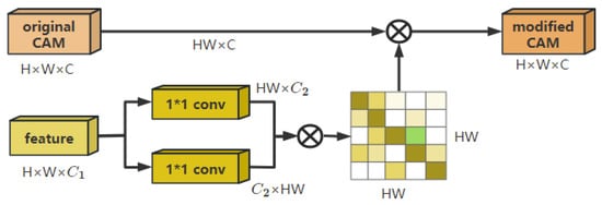 To further improve CAM accuracy by contextual information, we embed a pixel-correlation module proposed by SEAM [22] at the end of network (see Figure 1) to achieve the fusion of shallow feature of each pixel. Specifically, the pixel-correlation module, as shown in Figure 5, can quantify the correlation between pixels of feature maps of the convolutional classification network by calculating their cosine similarity to provide more comprehensive contextual information. Then, the non-negative similarity values after ReLU activation function can be added to the original CAMs to refine the CAMs, so as to enhance the model’s accuracy in pixel-level classification prediction of images. This process can be represented as: